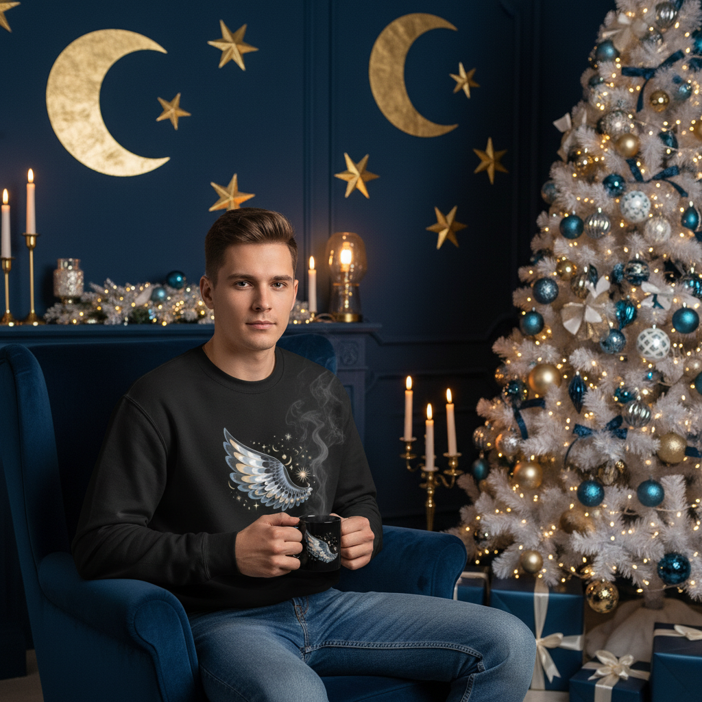 Stay cozy with our Night Wing Sweatshirt featuring celestial wing design in blue, grey, and gold. Premium cotton blend, warm and comfortable. Perfect for dreamers.