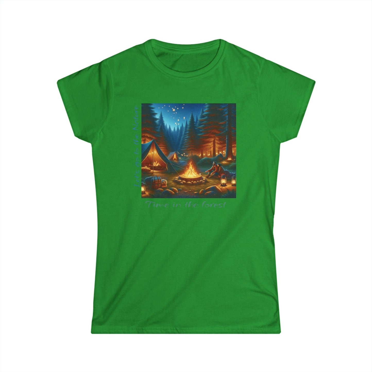 Soft women's camping tee with 'Time in the Forest' design. Perfect for outdoor lovers. Comfortable, stylish, quality fabric. Shop nature-inspired apparel!